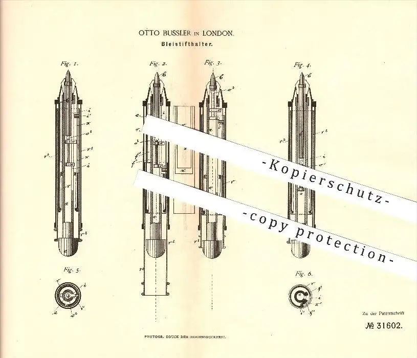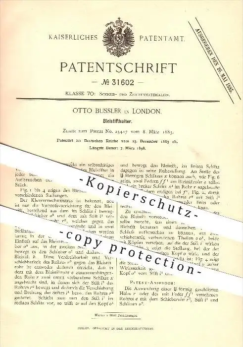 original Patent - Otto Bussler in London , 1883 , Bleistifthalter , Bleistift , Schreibwaren !!!