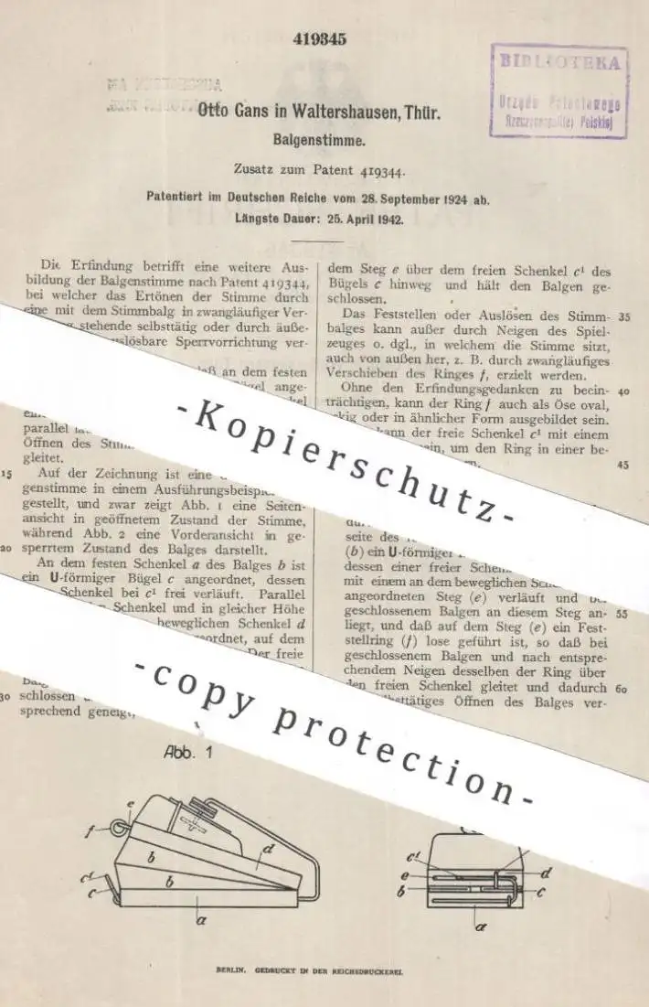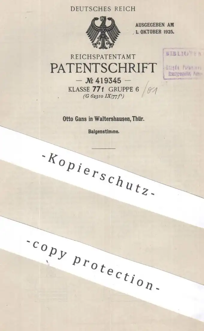 Patentinhaber: Otto Gans , Walterhausen , ThüringenPatent: BalgenstimmePatentiert am: 28.09.1924 P-460
