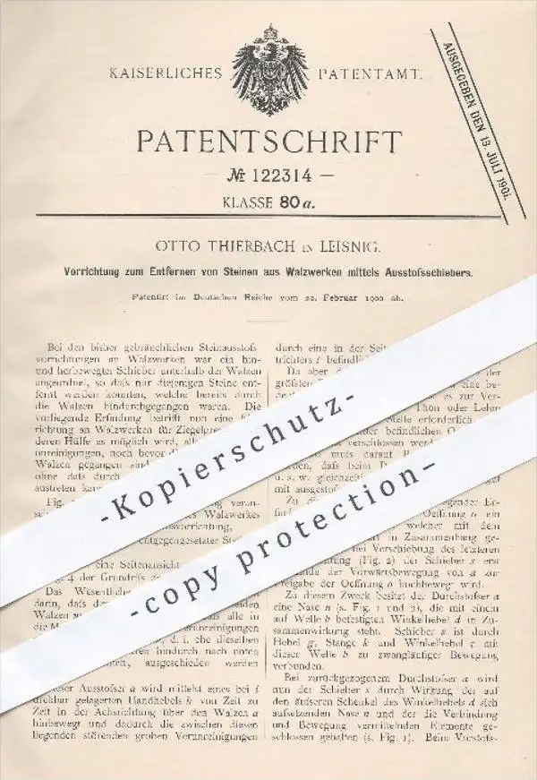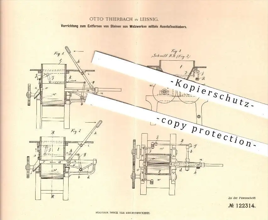 original Patent - Otto Thierbach in Leisnig , 1900 , Entfernen der Steinen aus Walzwerk , Walze , Walzen , Walzwerke !!