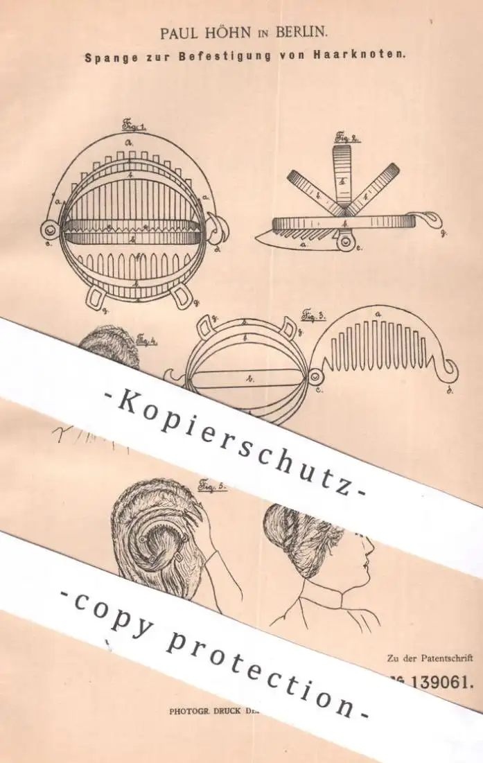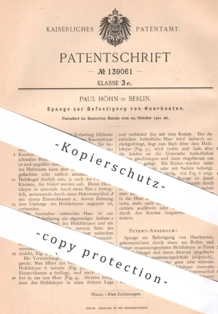 original Patent - Paul Höhn , Berlin | 1901 | Spange zur Befestigung v. Haarknoten | Haarspange , Friseur Frisur , Haare