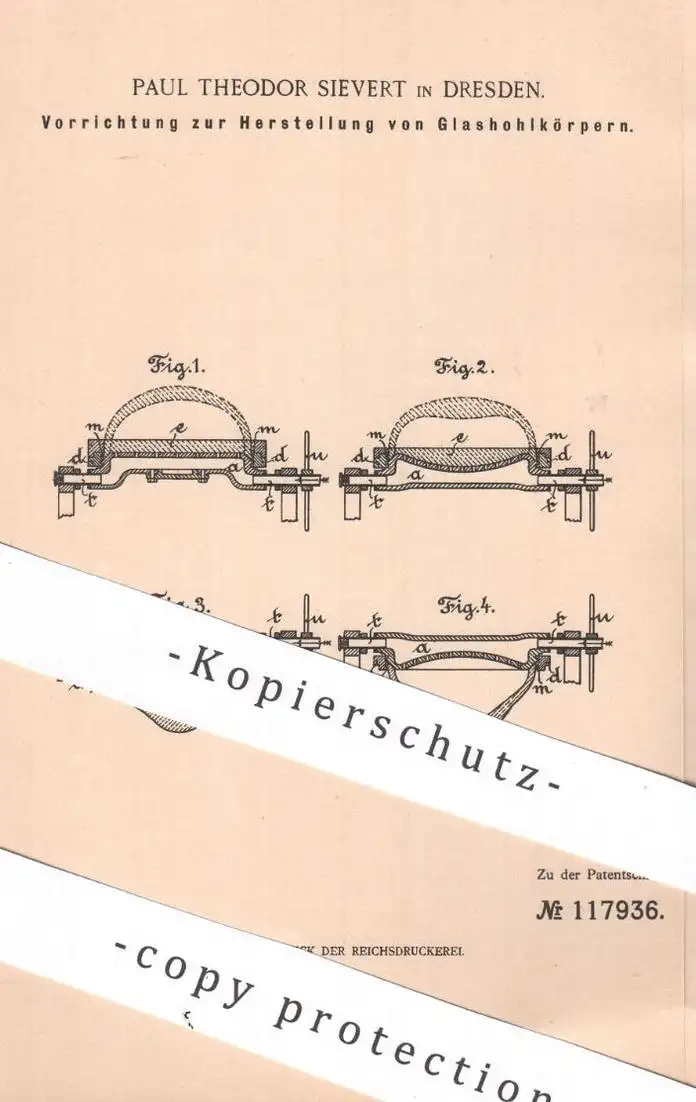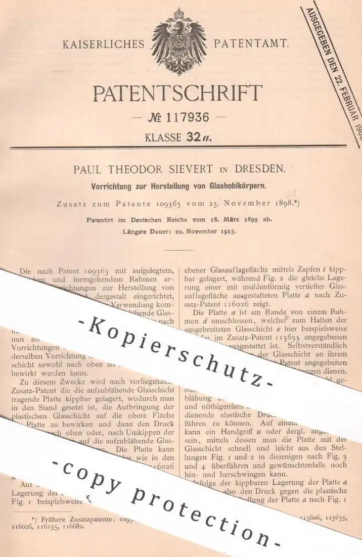 original Patent - Paul Theodor Sievert , Dresden , 1899 , Glashohlkörper | Glas - Hohlkörper | Glasbläser , Gläser !!
