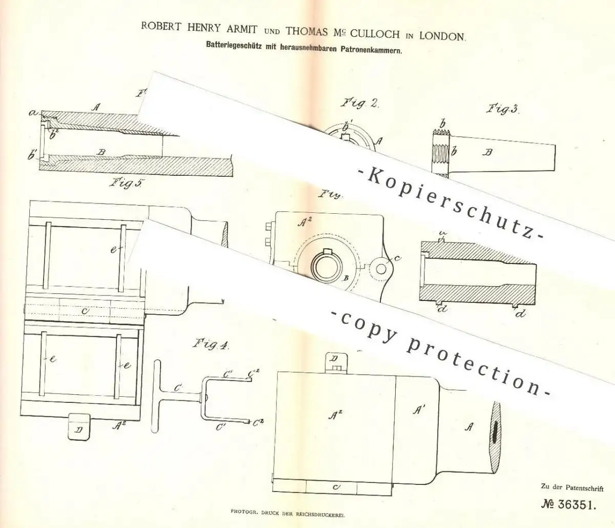 original Patent - Robert Henry Armit , Thomas Mc Culloch , London 1886 , Batteriegeschütz | Geschütz , Patronen , Waffen