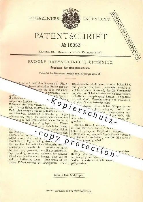 original Patent - Rudolf Dreyscharff in Chemnitz , 1882 , Regulator für Dampfmaschinen , Kraftmaschinen , Motoren !!!
