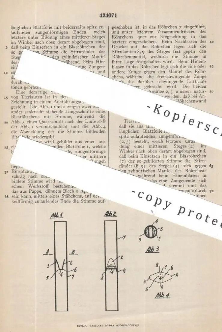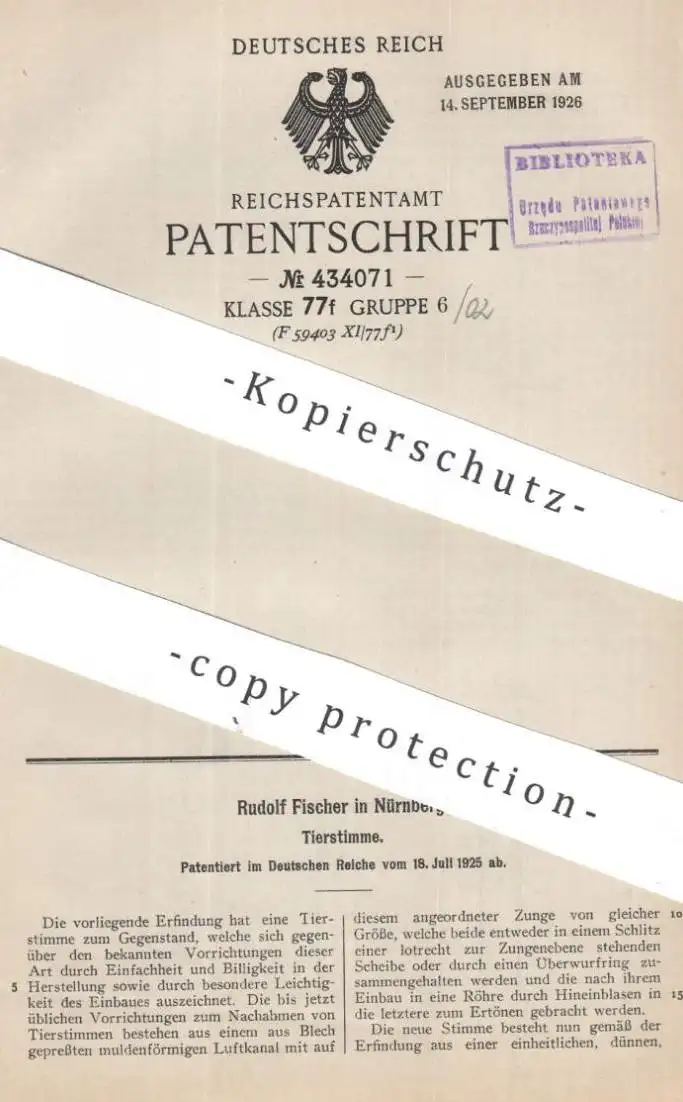 original Patent - Rudolf Fischer , Nürnberg | 1925 | Tierstimme | Tier - Stimme | Ton , Töne , Stimmen , Pfeife