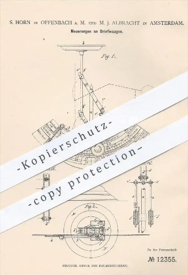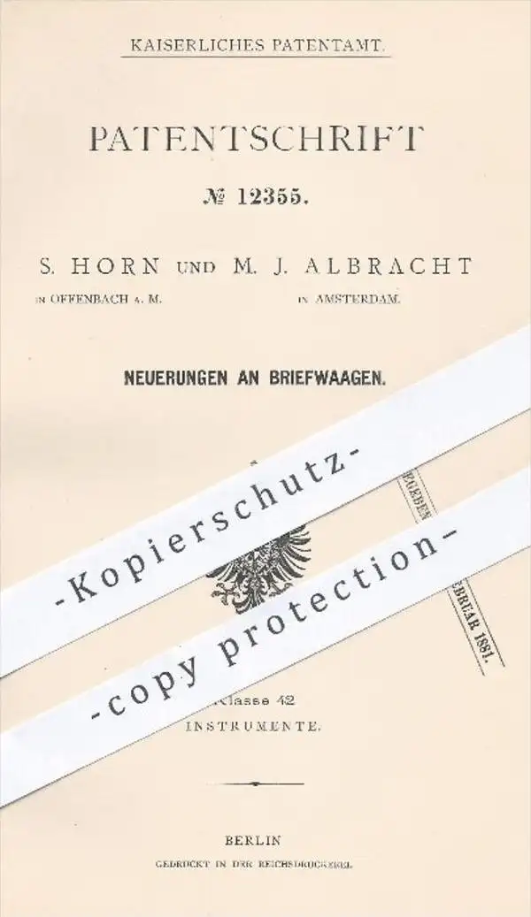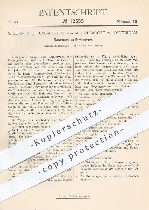 original Patent - S. Horn , Offenbach / M. J. Albracht , Amsterdam , 1880 , Briefwaage | Briefwaagen , Waage , Waagen !!