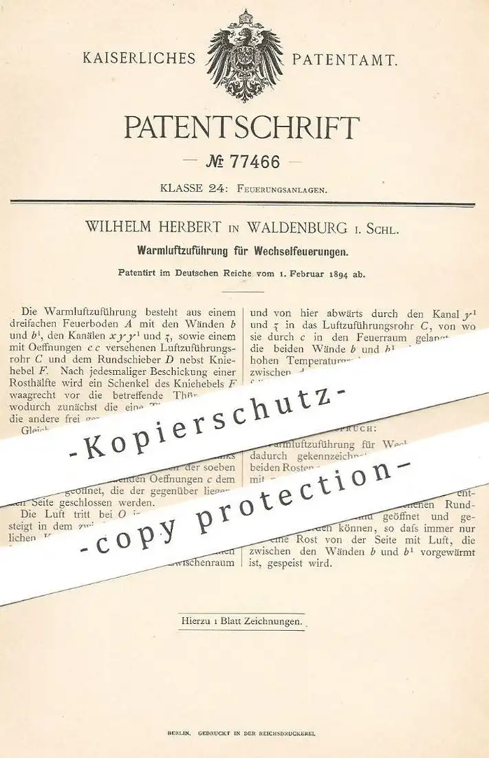 original Patent - Wilhelm Herbert , Waldenburg / Schlesien | Warmluftzuführung für Wechselfeuerung | Heizung , Ofen !