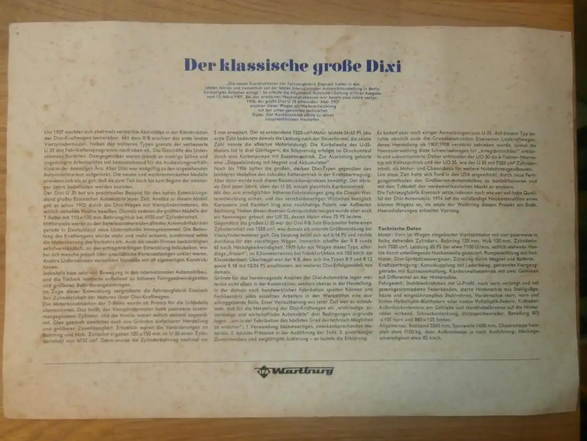 original Poster / Plakat DIXI U34 , 1907-1910 , Wartburg , Reklame / Werbung , mit technischen Daten und Beschreibung !! 420x295mm !! HeHa2