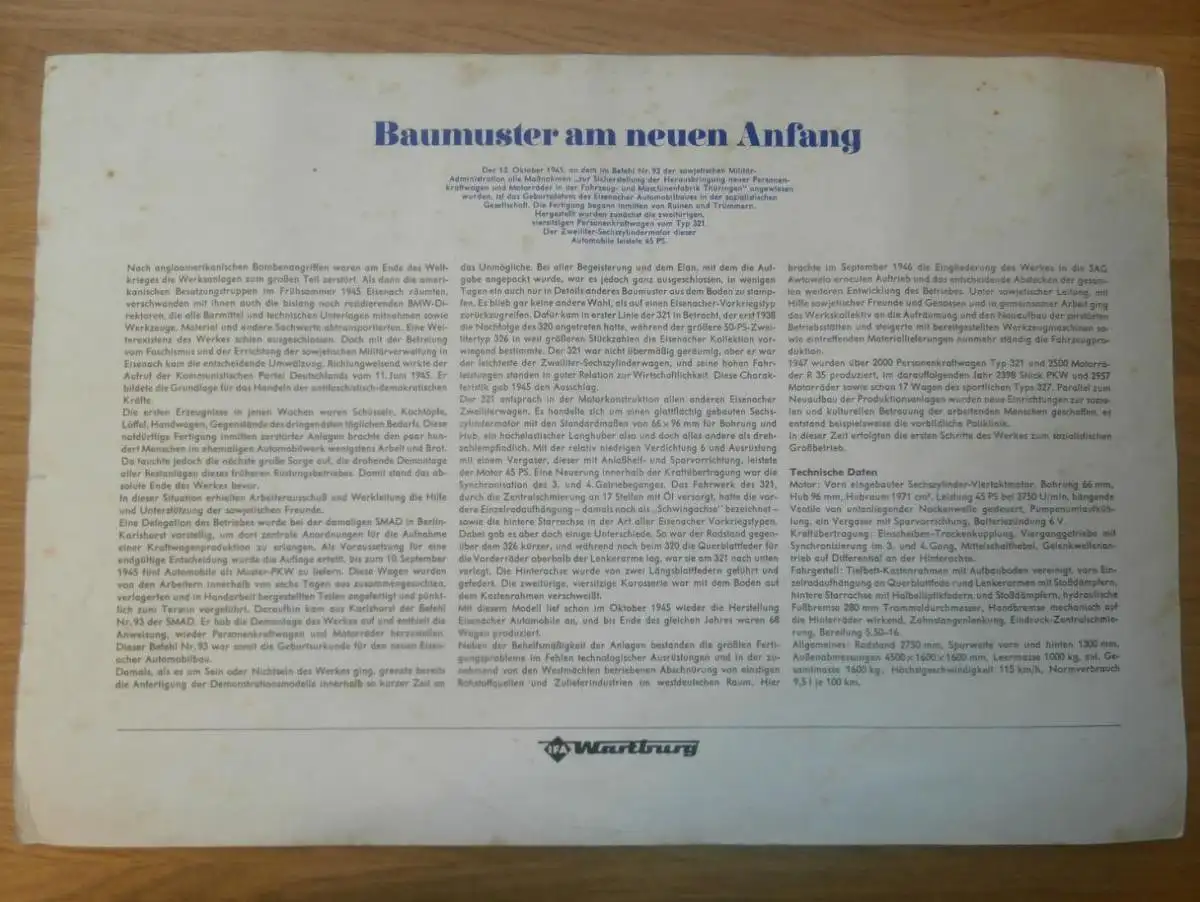 original Poster / Plakat - Typ 321 , 1945-1948, Reklame / Werbung , Wartburg ,mit technischen Daten und Beschreibung !!HeHa2