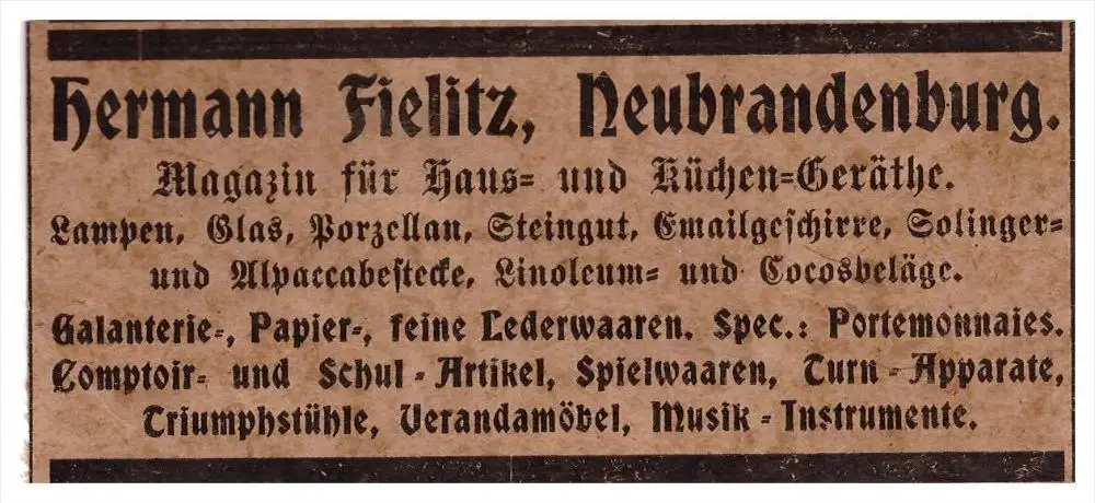 original Werbung - 1901 - Porzellan , Papier- und Spielwaren H. Fielitz in Neubrandenburg i. Mecklenburg !!!