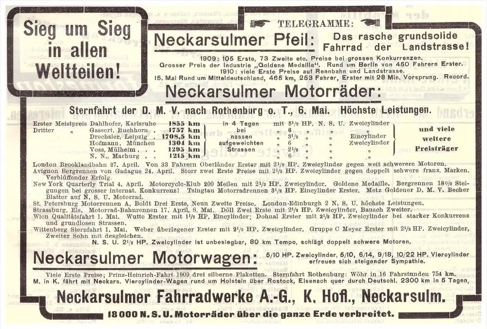 original Werbung - 1910 - NSU Automobile und Motorräder , Sternfahrt nach Rothenburg o.T., Neckarsulm , Oldtimer !!