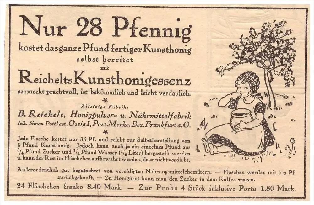 original Werbung - 1917 - Reichelts Kunsthonigessenz , Honig , S. Potthast in Ossig , Post Merke b. Göhren , Frankfurt !