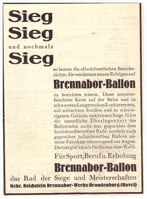 original Werbung - 1930 - Brennabor-Ballon , Sieg , Sieg ... Gebr. Reichstein in Brandenburg a. Havel !!!