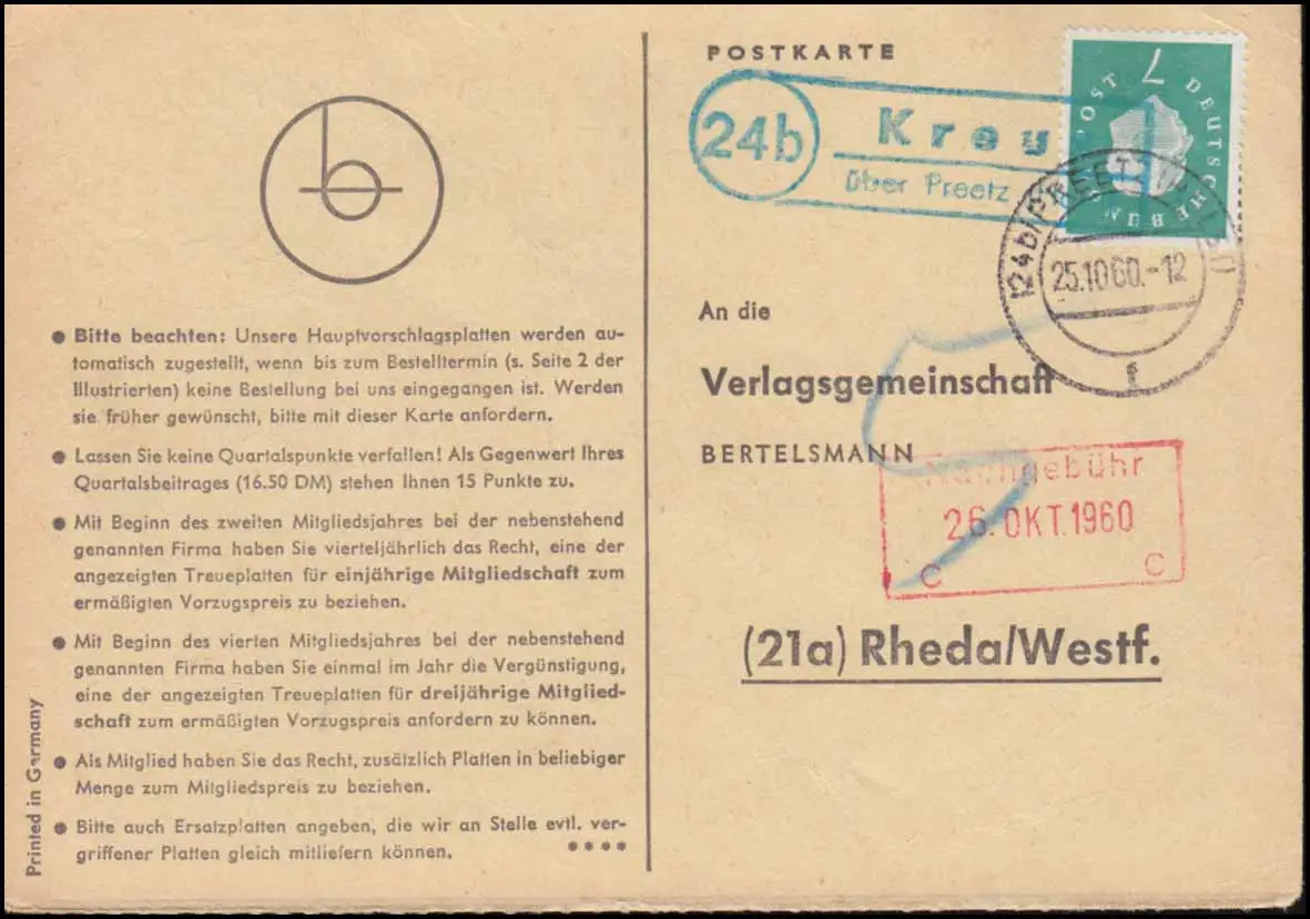 post-o-kreu bleu-vert sur PREETS (HOLSTEIN) 25.10.60, carte postale selon Rheda