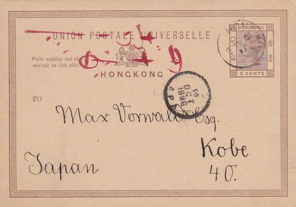 postcard from Hong Kong 1886 to Japan/Kobe, text in German