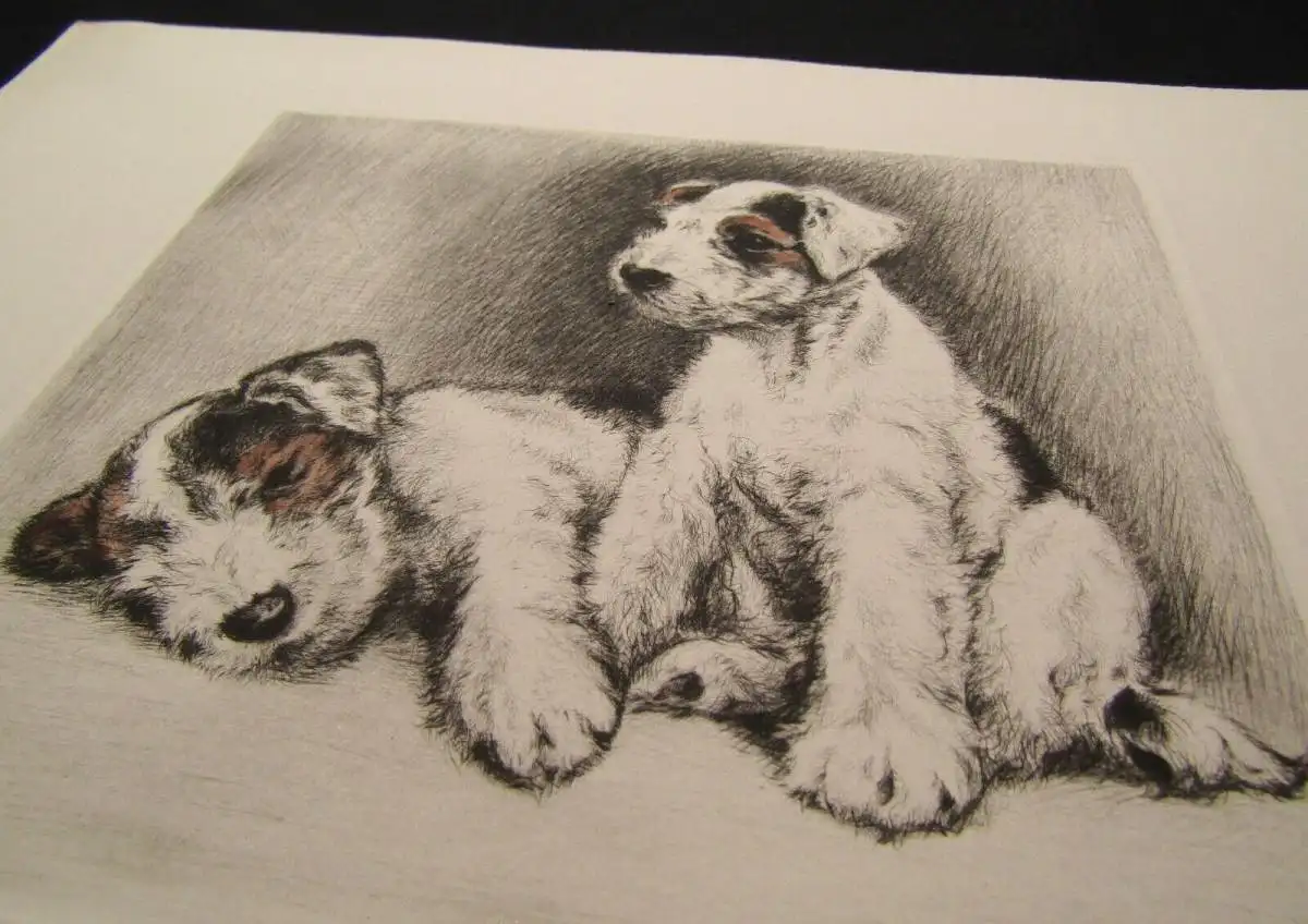 teilkorierte Radierung Zwei süße Terrier beim spielenum 1910