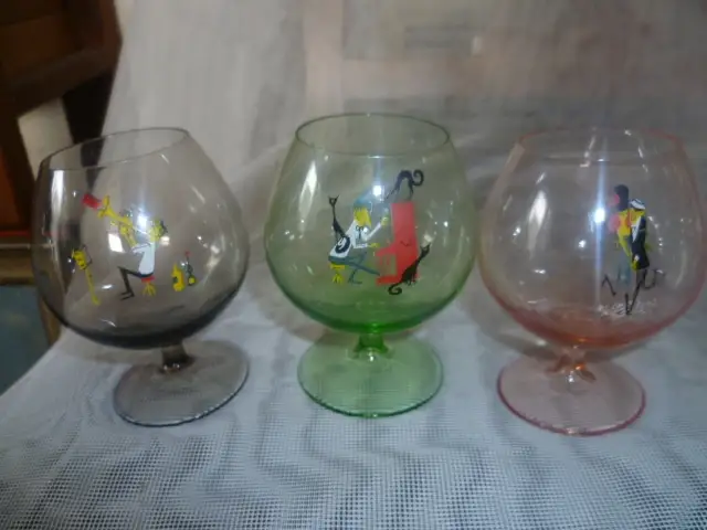 wohl Manufaktur Süssmuth kleine 3 Cognacschwenker bauchige Form mit Motiven der Rockabilly Ära aus den 1960 /70 Rockabilly Space Ära